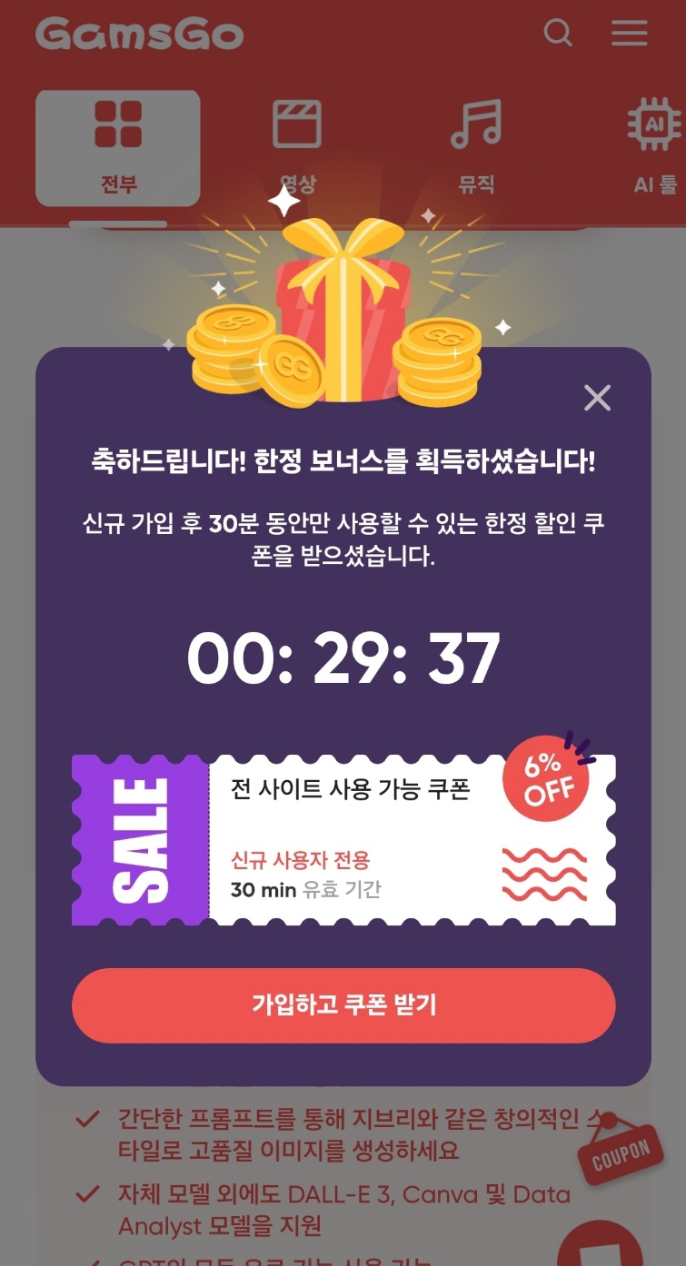 위 사진 추가 할인 쿠폰은 신규 가입후 10분 이내로 겜스고 모바일 홈페이지에서 대기하니 자동으로 생성되었다