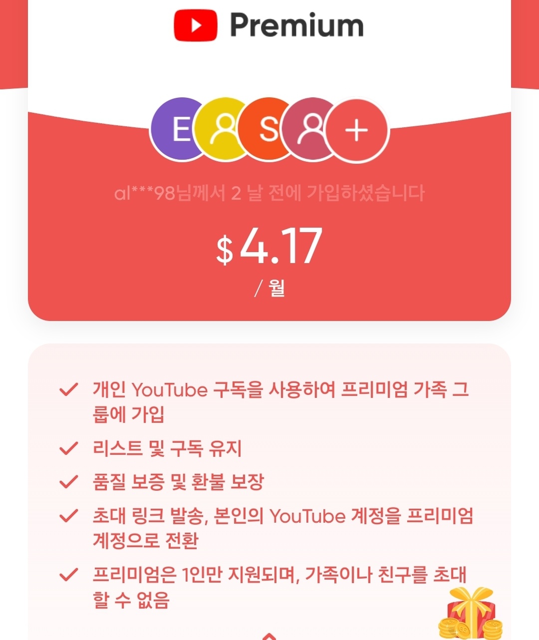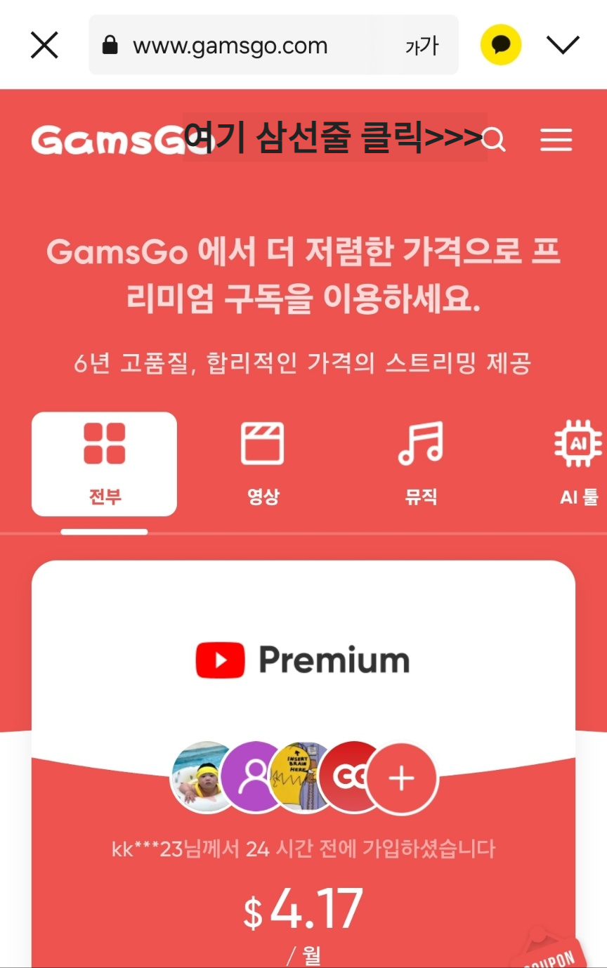 - YouTube Premium은 개인 구독 시 월 11,900원이지만, 겜스고에서는 $4 내외로 이용 가능