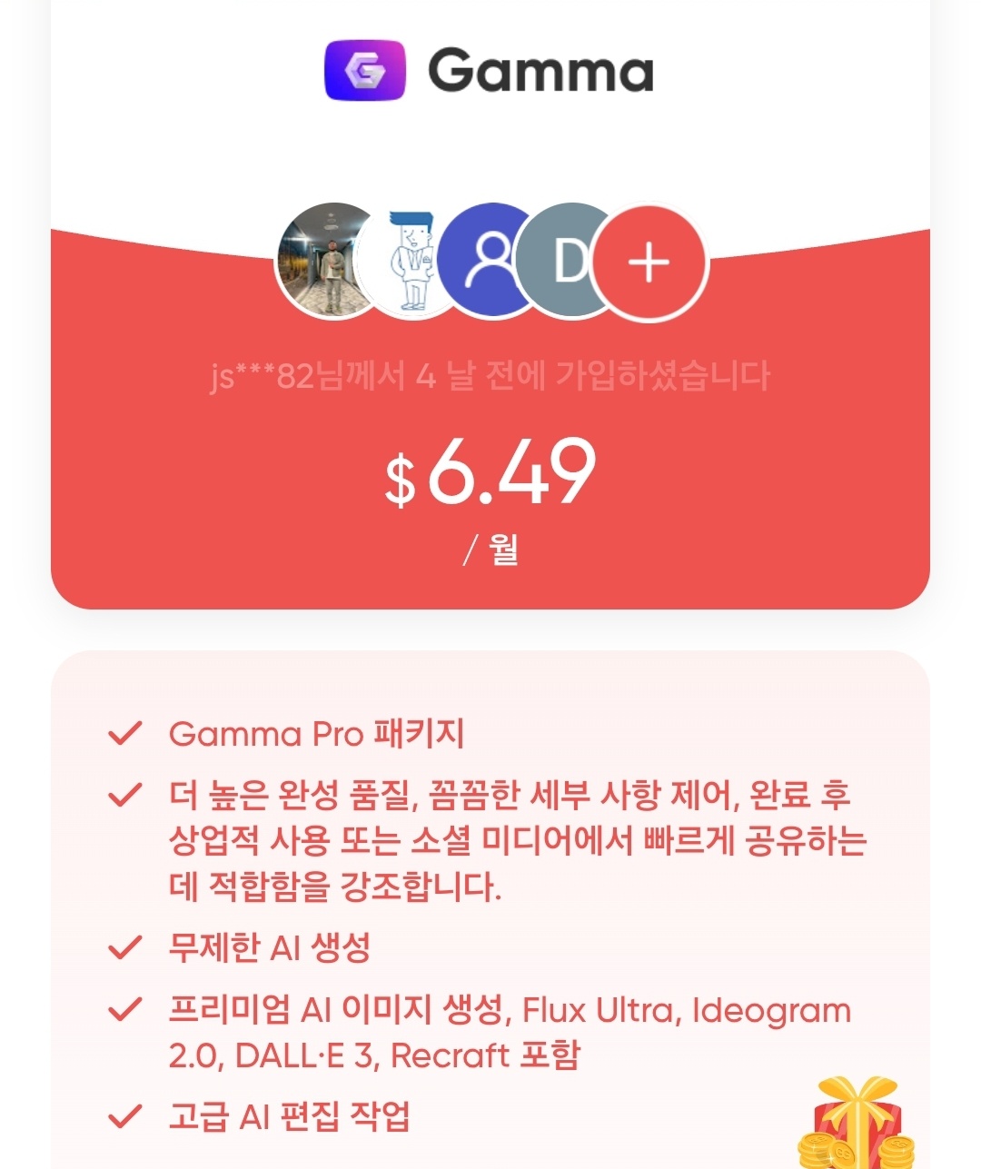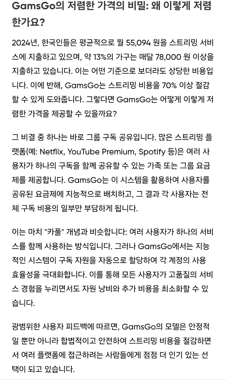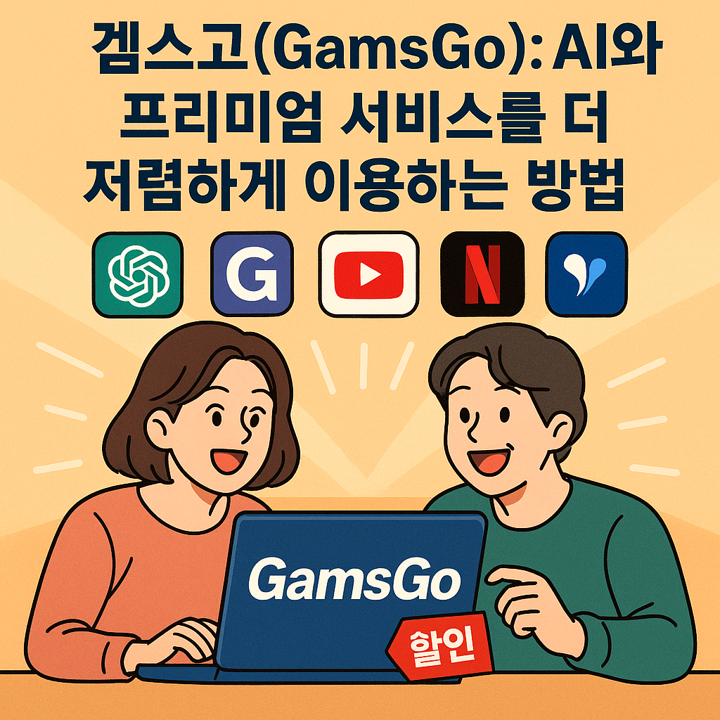 겜스고(GamsGo)는 ChatGPT, Gamma AI, Spotify, YouTube Premium, Netflix 등 다양한 프리미엄 서비스를 공유 계정 방식으로 저렴하게 이용할 수 있게 해주는 플랫폼이다. 일종의 '가족 계정' 개념으로, 혼자서는 비싸게 느껴질 수 있는 여러 구독 서비스를 합리적인 가격에 이용할 수 있다.