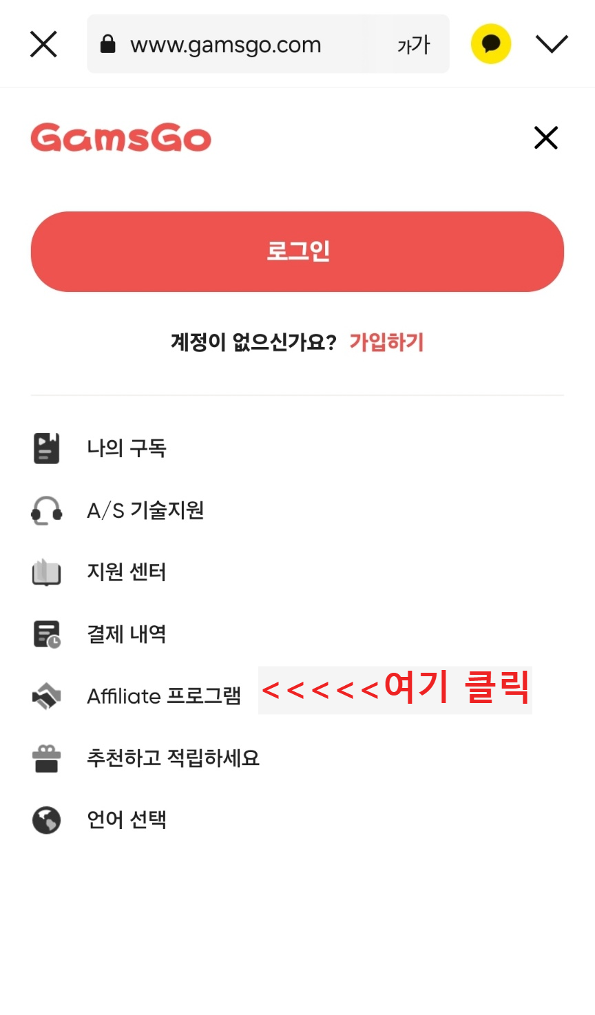 겜스고 모바일 기준 메인 화면 우측 상단 "삼선 버튼 " 클릭 후 Affiliate 프로그램 가입 버튼이 나타난다