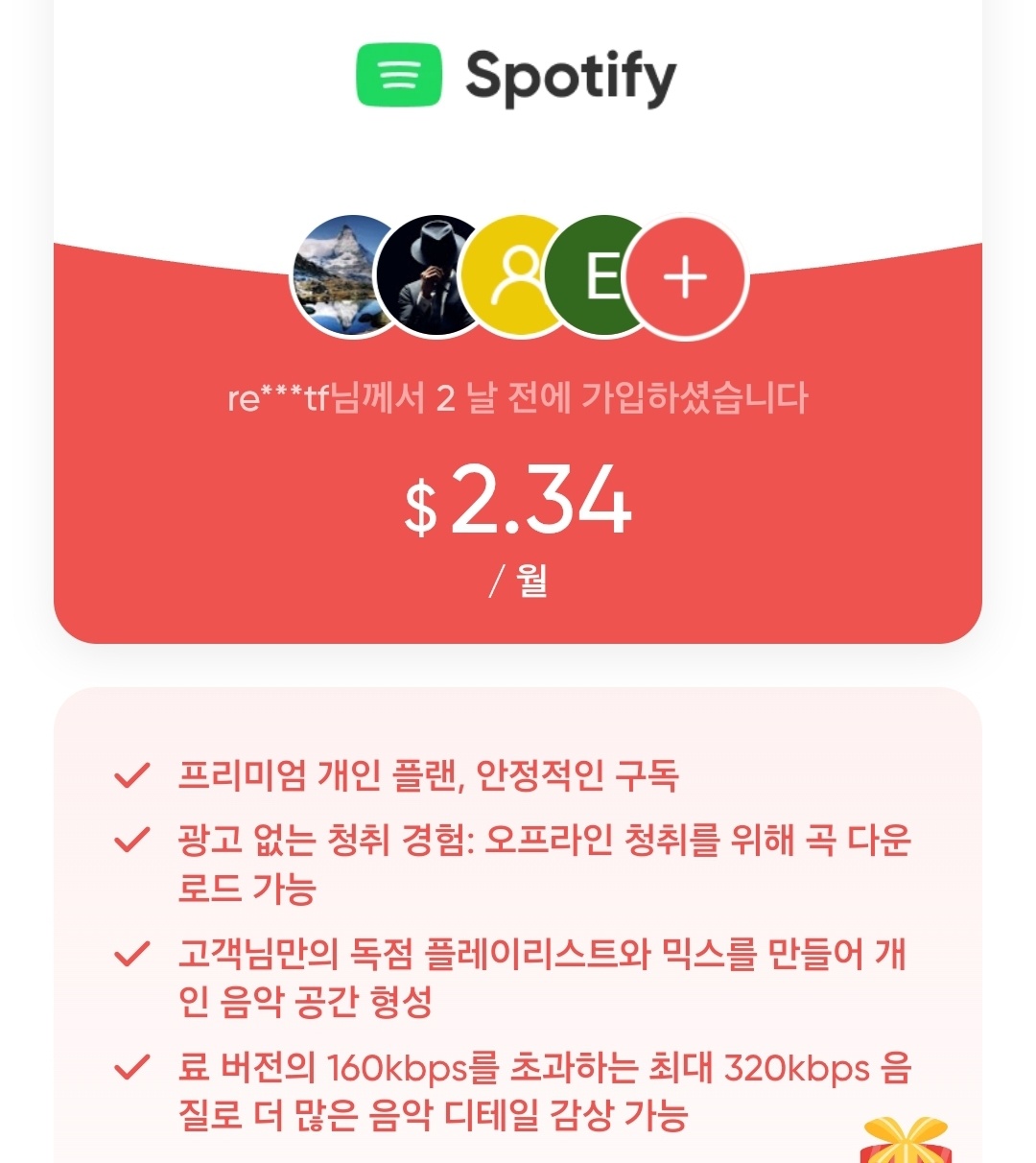 - Spotify Premium 개인 요금제는 월 10,900원이나, 겜스고에서는 $2~3 수준으로 제공