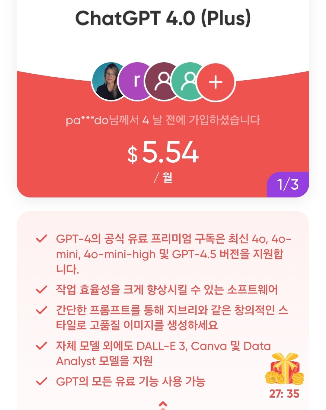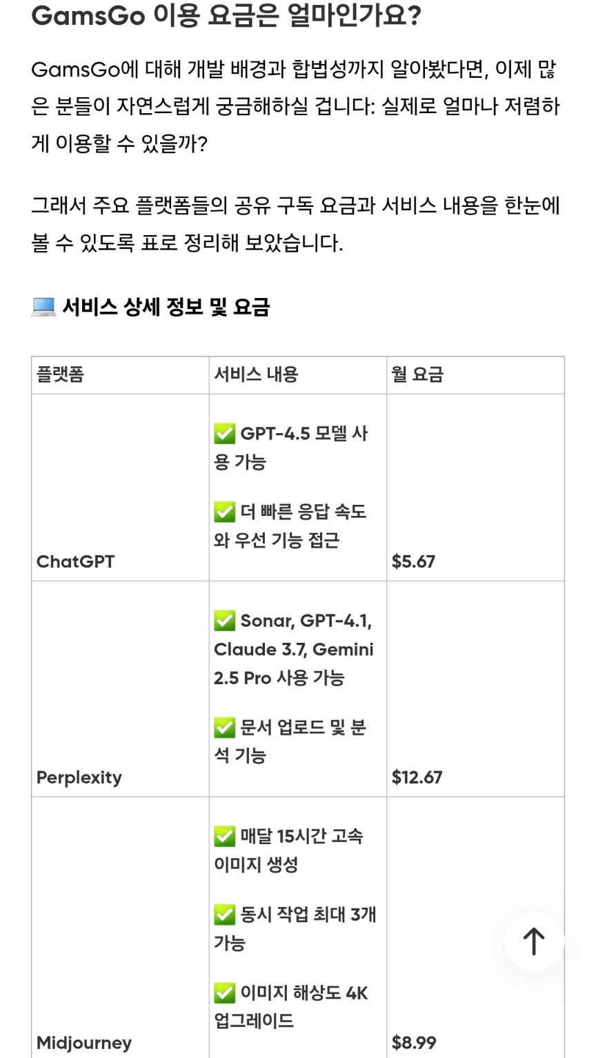 - ChatGPT Plus 정식 구독은 월 $20인데 비해, 겜스고에서는 약 $5~6 정도로 이용 가능