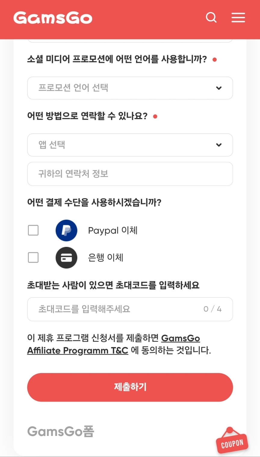 위 지금 바로 할인 받기 클릭 후 겜스고 메인화면 우측 상단 삼선줄에서 " Affiliate(제휴) 프로그램 " 등록이 가능하다